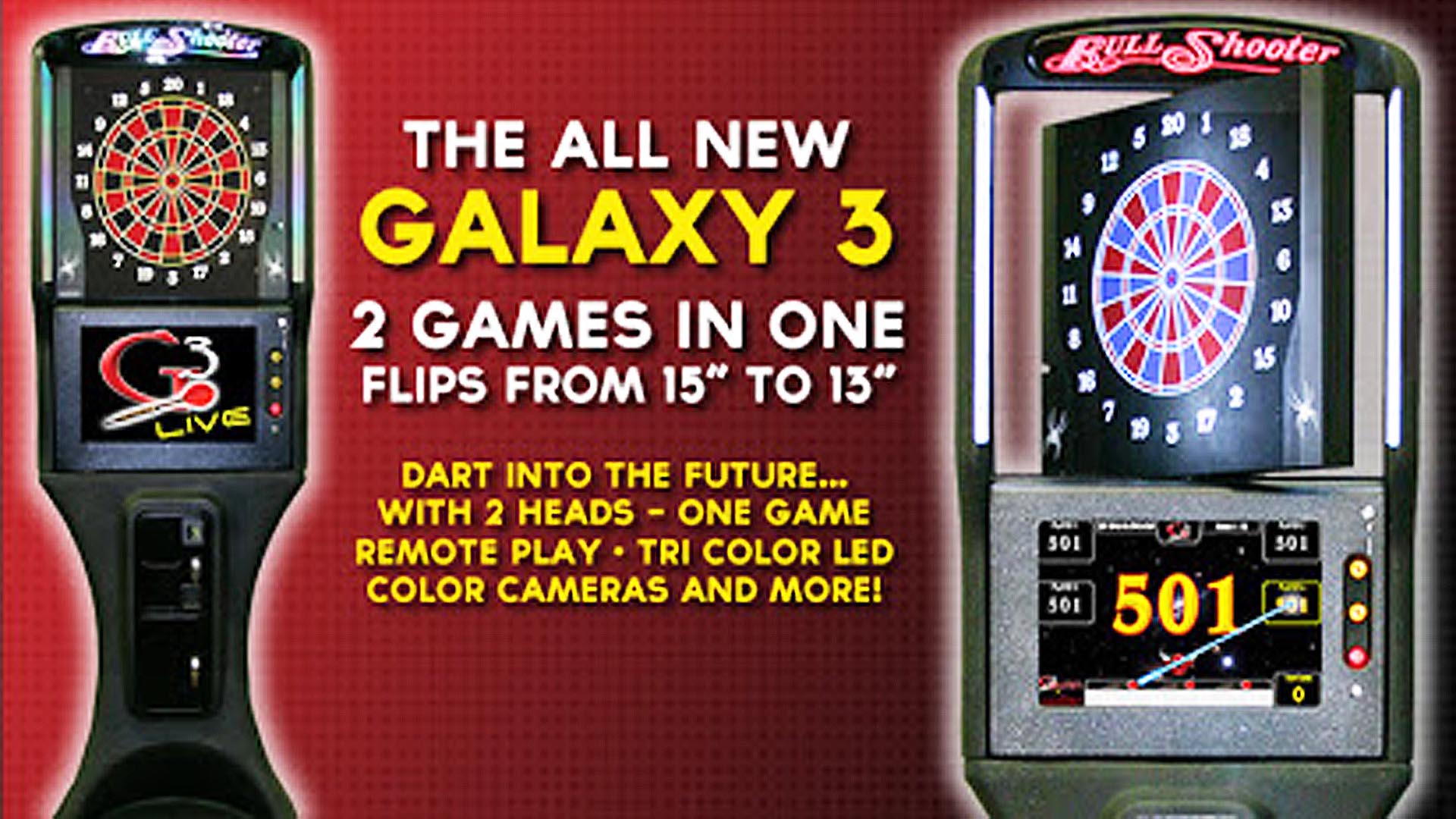 Arachnid’s Newest Commercial Dartboard To Date Features Dual “Flip” Dartboards + LED Lighting. The Galaxy III Comes With Both The Traditional 15″ Darthead And The New European-Sized 13″ Darthead, Both Of Which Are Mounted On A Rotating Back Board – Just Flip & Switch! New LED Illuminated Dart Target And Marquee. New Graphics, Sounds, And Featured Animations Are Displayed On The Built In LED Monitor. Attractive Full-Color LED Illumination On The Sides Of The Cabinet Gives Players A Well Lit Board To Aim At In Dark Rooms. Unit Features A Full Slate Of 01 And Cricket Games, And Has An Attract Mode. Machine Set To Freeplay. Includes 6 Darts With Soft Dart Tips. Dimensions: 79.5″H X 27″W X 18.5″D, 225 Lb