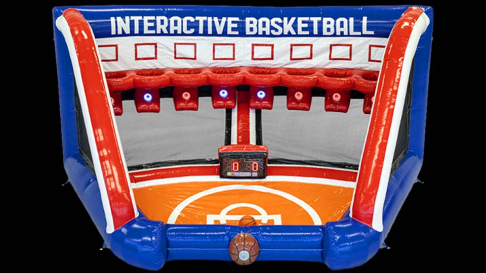 Our Basketball Multiplayer Inflatable Game is 2 to 4 players, has electronic scoring, colored lights under the rims, and colorful graphics. Our basketball inflatable challenge game is 9′ tall so it will work both outdoors and inside most venues. Our inflatable basketball game offers an exciting spin on basketball. Under every basket there is a colored light that randomly changes to red or green. Each team has a colored spot for their team, red or green. Each team must try to score in the basket with the correct color, but the colors randomly change! Make the shot when it is your color to score points, but if the color changes you scored for the opposing team. Play 1 on 1, 2 on 1, or 2 on 2. This is a great game for guests that have seen it all. Get as many points as possible and defeat your opponent. Each game is 45 seconds and is very challenging. After the game is over it will announce if the red or green team won. Click the link to see more basketball games.