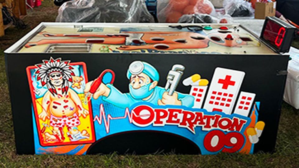 Our Premium Giant Operation Is A Life Size Version Of The Game You Played As A Child. Beware Of The Cheaper Knockoffs Some Companies Offer That Are Smaller In Size Or Have Less Features. This Patient Is 6′ Long And He Talks Along With Sound Effects, LED Count Down Timer, 14 Crazy Body Parts To Remove, Oversized 18″ Tweezers, And Of Course The Nose Lights Up Every Time You Touch The Edges! This 2-4 Player Game Is Based On Which Player/Team Collects The Most Body Parts Without Hitting The Edges And Setting Off The Alarm! Every Guest Will Want To Try This At Least Once! This Game Has An Internal Battery As Well So It Can Be Set Up Without Access To Electricity. Dimensions: 6’L X 3’W X 30″H
