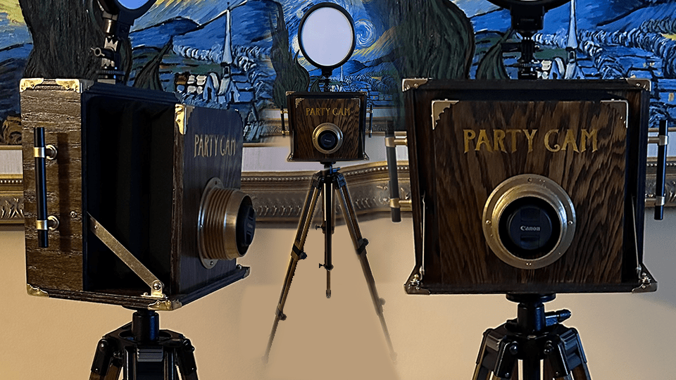 Our new Retro Roaming Photo Booth is a hand-made roaming photo booth with the look of a 1920’s camera. This beautiful, hand-crafted photo booth has a real Canon DSLR camera built inside it to capture amazing photos! The Retro Booth can be mounted on the matching wood tripod as a stationary photo booth or be detached from the tripod and used as a roaming booth to roam your party and capture all the action! Customizable filters included so the guest photos can have that old fashioned brown sepia tone, full color, or black & whites. Your logo can be added to all the photos and you will receive a digital master copy of all the photos.
