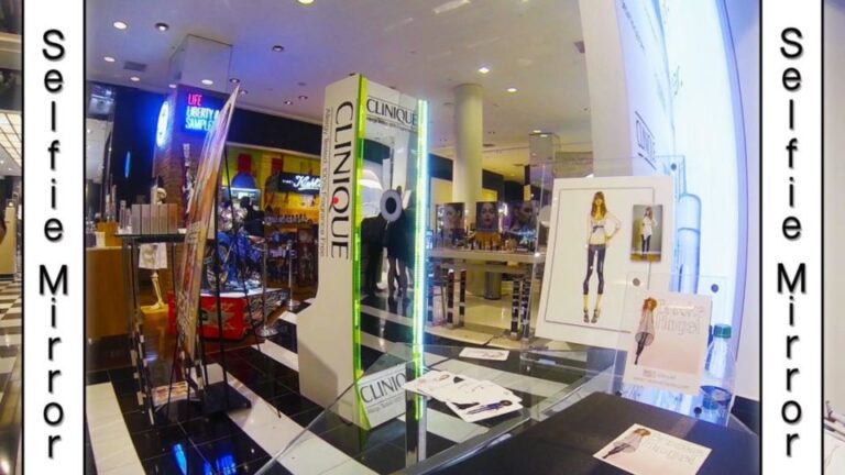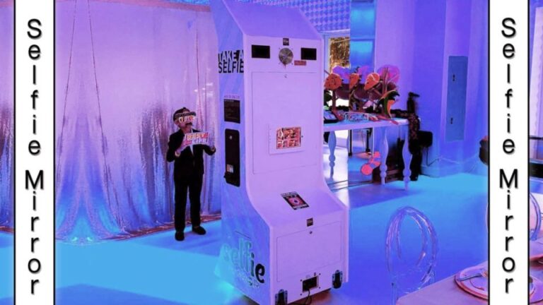 The Selfie Mirror Photo Booth is a life-size 7′ mirror with LED lights that takes your photo!