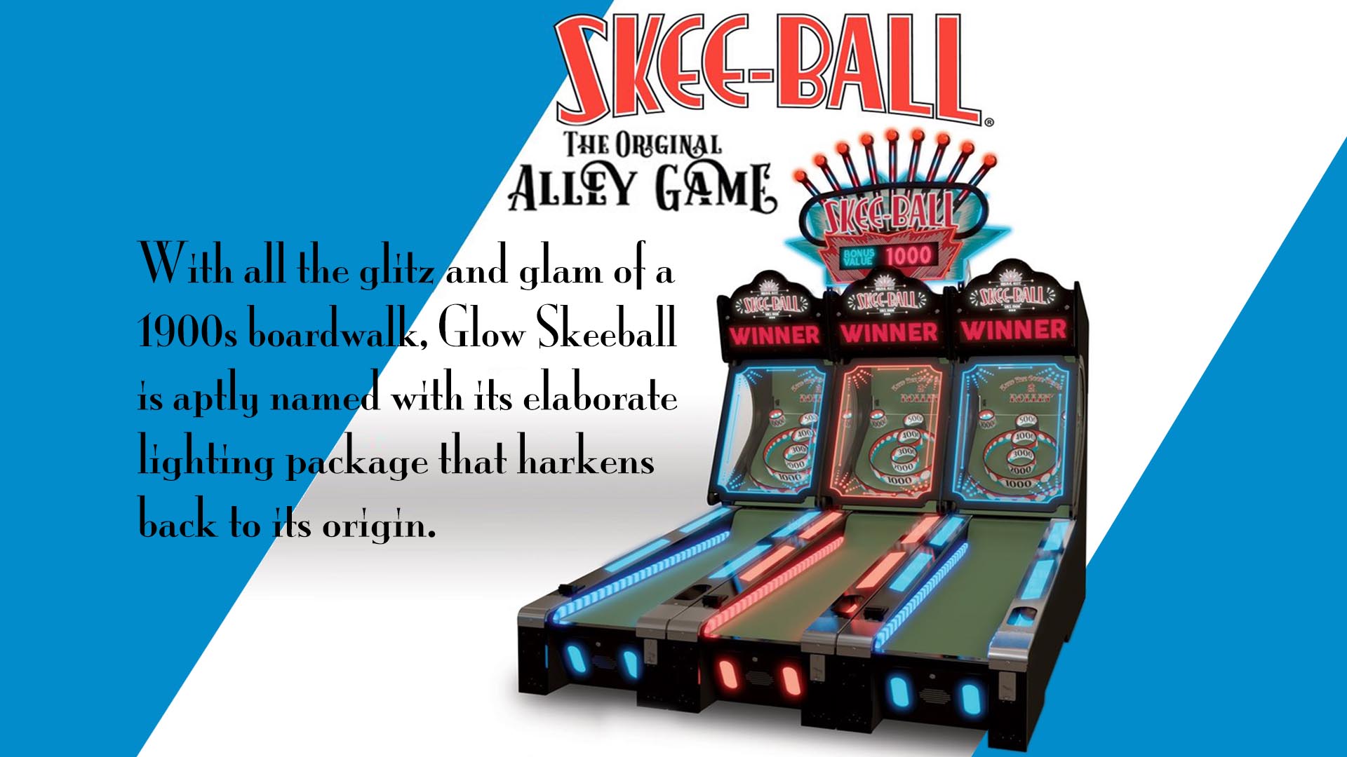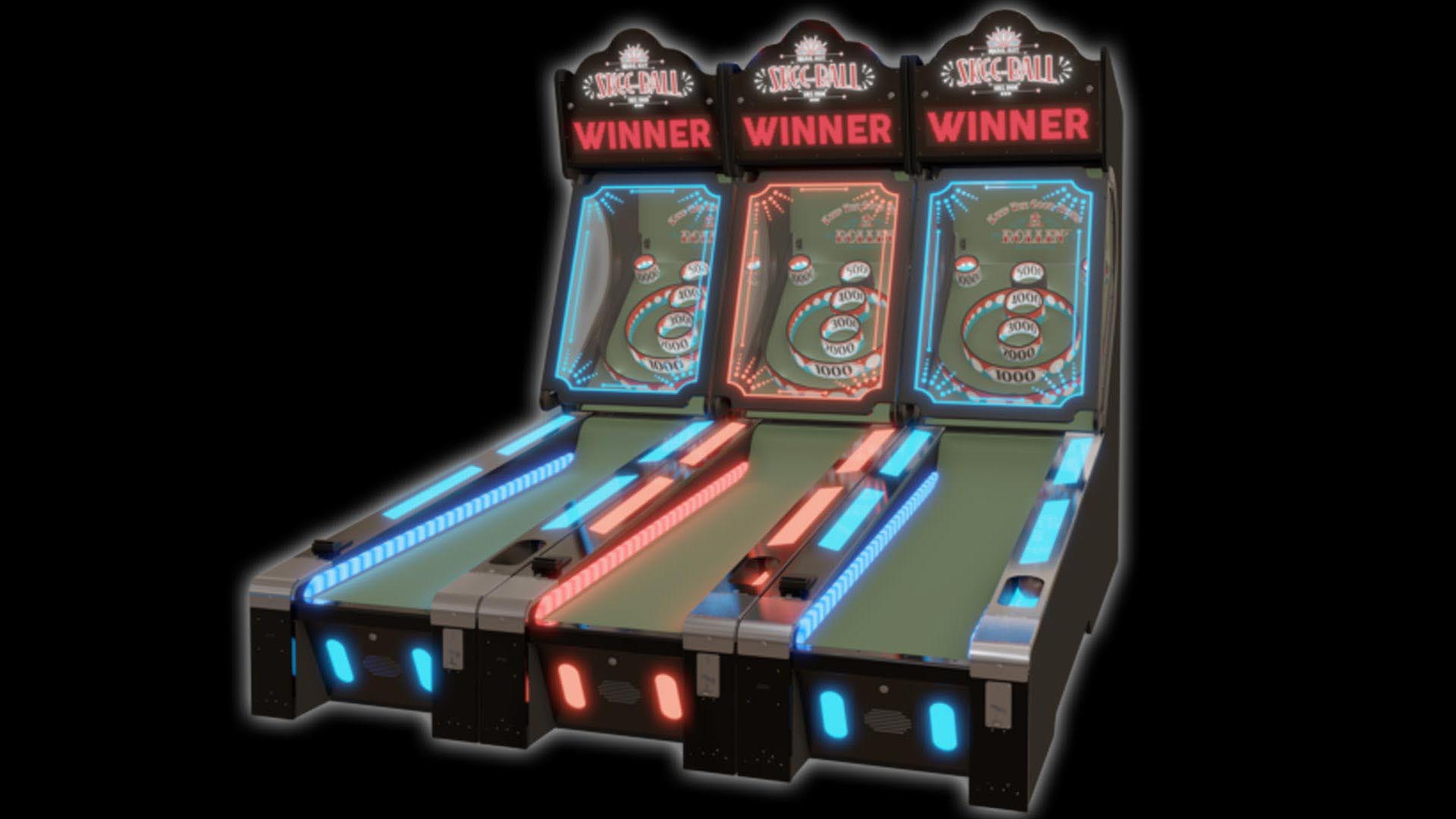 Skee-Ball Is The Original Alley Game With An Elaborate Lighting Package And All The Glitz And Glam Of The 1900’S Boardwalk Game When Skee-Ball Was Born. This New Look Reflects The Vintage, Glamorous Style, But With State Of The Art LED Lighting. Dimensions: 630 Lbs Ea., 1 Lane 10’3”L X 2’6”W X 7’8”H,